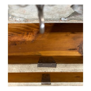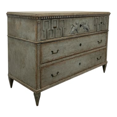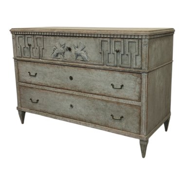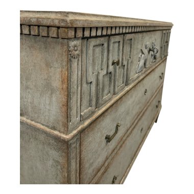 Gustavian-style chest of drawers in a warm shade of gray. A decorative toothed molding sits beneath the top. The entire top drawer features a decorative Gustavian motif. The remaining two drawers feature only their original brass handles. All locks are original (overlay) and functional, with one key included. Classic tapered legs. The furniture is crafted from maple (the drawer front and body) and pine (the back).