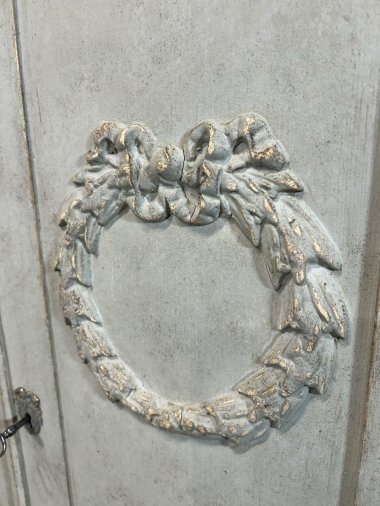 A simple and elegant light grey Swedish antique buffet. A decorative strip with serrated edges sits beneath the top. Two columns run along each side. Each door is adorned with a wreath. The doors are lockable, with an original working lock and one key included. The interior is white and features three shelves at a fixed height. The legs are sturdy and tapered towards the bottom.
