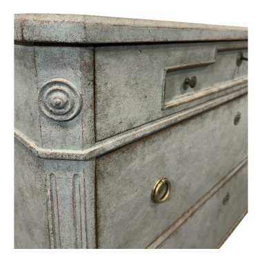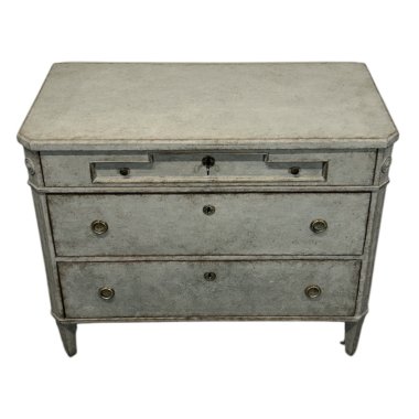 A unique Swedish chest of drawers reminiscent of the Gustavian style, in grey with white highlights. The top drawer features a rare decorative element on the drawer front, a concave decorative element on the surface. It also features brass knobs. The top drawer is separated from the rest of the unit by a delicate strip running around the entire unit. The remaining drawers have brass handles and original locks, with one key included. The corners are chamfered and decorated with a decorative element on the top. The classic legs taper towards the bottom.