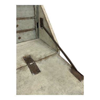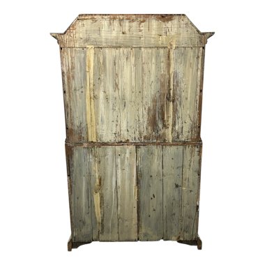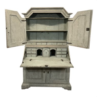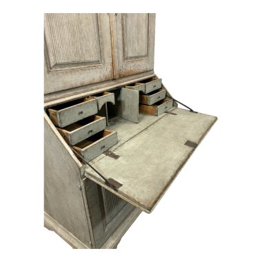 The bottom section is a writing desk. Inside, there are eight small drawers and one storage compartment. The drawers have brass knobs. The bottom section has double doors like those on the sideboard. All hinges, door guides, and locks (except for the one mentioned) are original. All locks work and are supplied with three keys. Stable, sturdy legs.