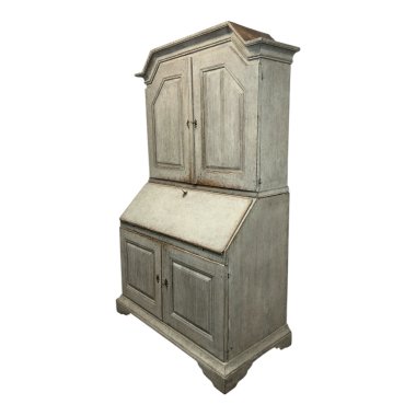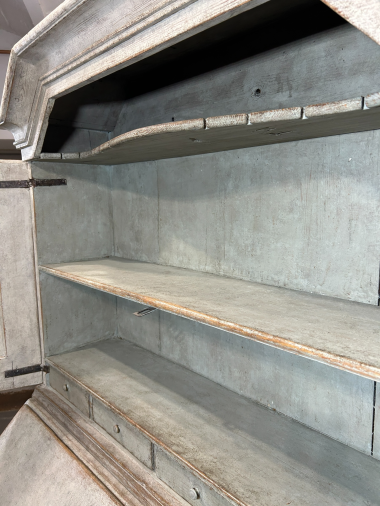 Antique Swedish cupboard in light grey. The top section has two lockable doors. The doors are adorned with milled panels. The interior is a muted turquoise. Inside, there are two shelves (at a fixed height) and three small drawers at the bottom. The drawers have wooden knobs.