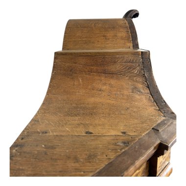 Beautiful and unique Dutch baroque style cabinet with many glazings. The furniture is made of oak wood and covered with walnut veneer (burl). The cabinet consists of two parts - upper and lower. The upper part is a glass display case, with three shelves mounted at a fixed height, made of pine wood (newer than the furniture). The whole is topped with a beautiful and richly decorated crown. The upper part is folded into 6 small parts. The lower part has 3 drawers with amazing decorative curves. The drawers have brass handles, without locks.