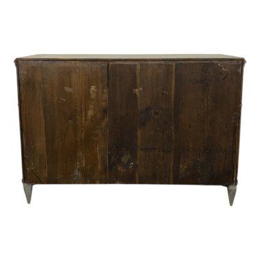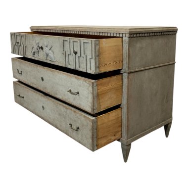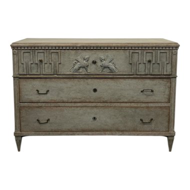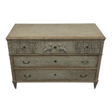 Gustavian-style chest of drawers in a warm shade of gray. A decorative toothed molding sits beneath the top. The entire top drawer features a decorative Gustavian motif. The remaining two drawers feature only their original brass handles. All locks are original (overlay) and functional, with one key included. Classic tapered legs. The furniture is crafted from maple (the drawer front and body) and pine (the back).