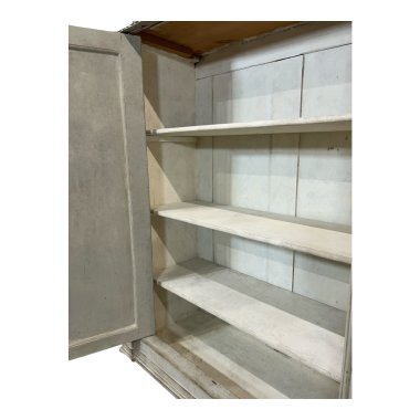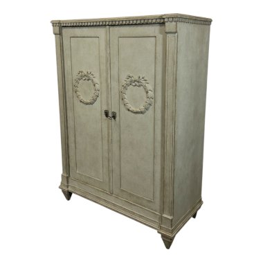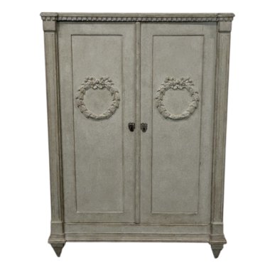 A simple and elegant light grey Swedish antique buffet. A decorative strip with serrated edges sits beneath the top. Two columns run along each side. Each door is adorned with a wreath. The doors are lockable, with an original working lock and one key included. The interior is white and features three shelves at a fixed height. The legs are sturdy and tapered towards the bottom.