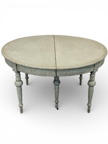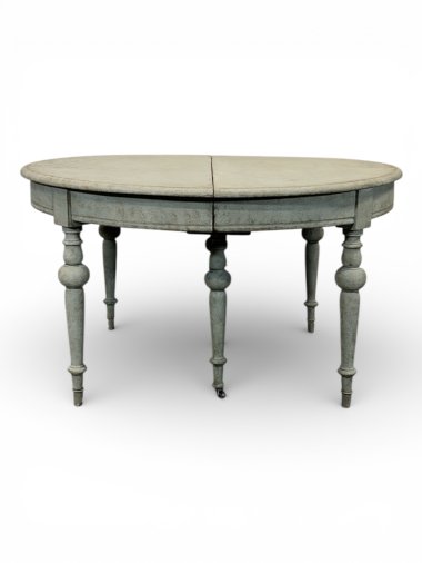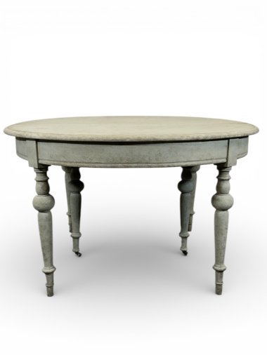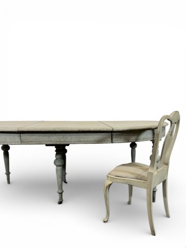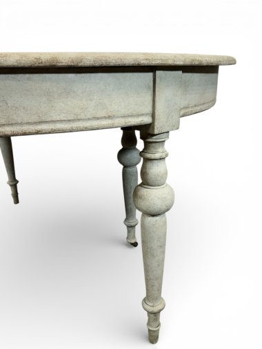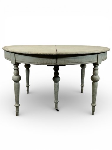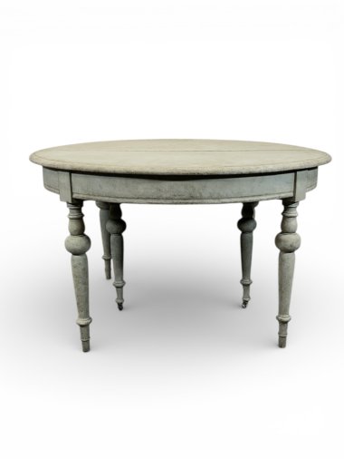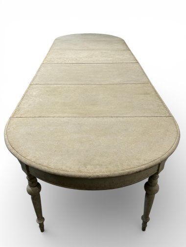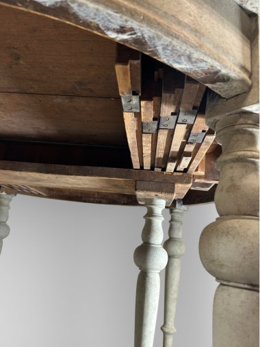 A beautiful and unique extendable dining table with four inserts. The table features original wooden (oak and pine) runners, allowing the table to extend to over 413 cm. Two additional legs are permanently attached to the wooden runners, providing very strong support for the entire structure. These two additional legs feature original antique casters, allowing for smooth extension. All six legs are the same shape – round and turned. When fully extended, the table forms a nearly perfect circle. Each insert has an apron and hooks for connecting everything together. The apron height is 62.5 cm, providing ample legroom. The generous width of 129 cm provides a generous surface area of approximately 5 m². The piece was crafted from three types of wood: walnut, oak, and pine in the mid-1800s.