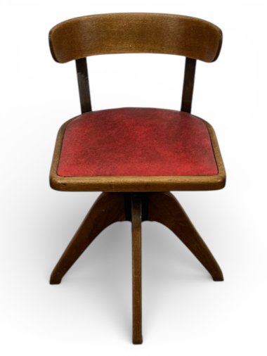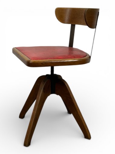A swivel office chair from the mid-20th century. Crafted from varnished oak, it's in very good condition. Four sturdy legs form the chair's base. The chair features a steel screw mechanism, allowing for seat height adjustments of up to 6 cm. The seat is upholstered in red imitation leather. The all-wood backrest is mounted on two gently springy steel supports. The chair is in very good condition and will be a decoration for any modern room.
