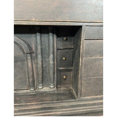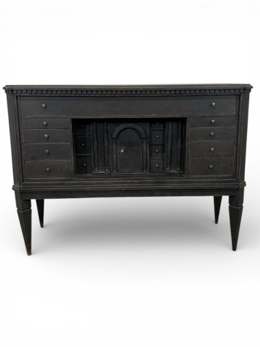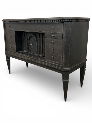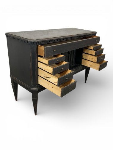 A truly unique Swedish chest of drawers with numerous drawers in a deep black finish. A toothed strip sits beneath the top. The unit features 23 drawers of varying sizes and one lockable compartment. The drawers have brass knobs. Stylish decorative columns flank the compartment. This drawer slides sideways and conceals six small drawers. The sides are chamfered and decorated with a milled strip, which flows seamlessly into long, tapering legs. The unit is crafted from pine and birch wood (all the small drawers).