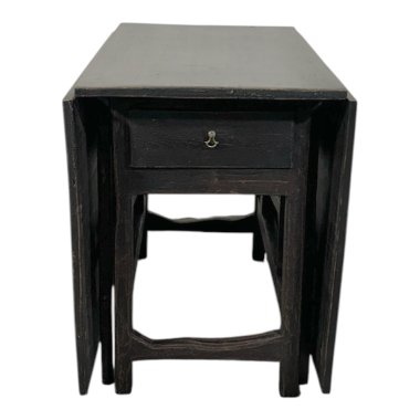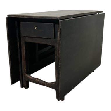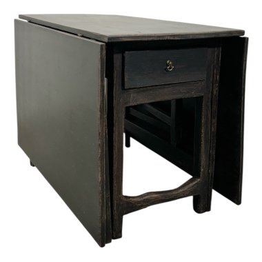 An antique farmhouse chopping (slågbord) table from Sweden, finished in black. The table has two extendable wings (66 cm long) supported by a special mechanism. This mechanism allows the table to be completely folded down to a compact size. Two drawers with brass handles are located on either side of the table. To my knowledge, the drawers have been replaced over the years. Both wings are suspended and fold out on metal hinges. The tabletop shows visible surface damage (from cutting with a knife or other sharp object) from years of use. When fully extended, the table can seat up to 10 people. When fully folded, the table is 60 cm long. Despite its age, it is still very functional.