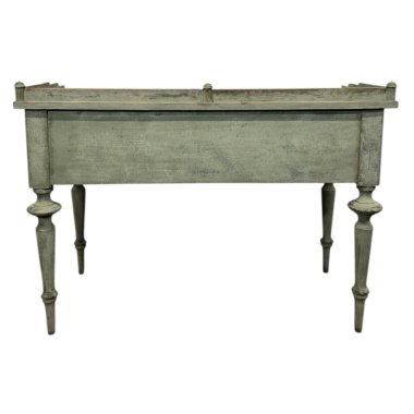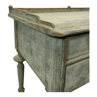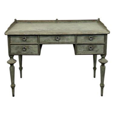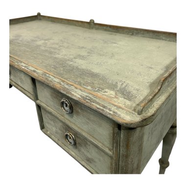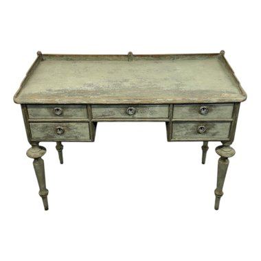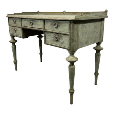 Swedish antique writing desk in green with beautiful patina. On the edge of the tabletop, on three sides, there is a beautiful and sophisticated border. The desk has 5 drawers with locks, all locks work, 1 key included. The legs have a beautiful turned shape, they are stable. The furniture is made of pine wood. The furniture comes from Sweden.