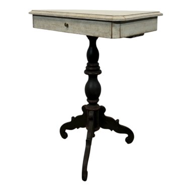 Swedish rectangular side table in black and white . The rectangular top is supported by 1 column topped with 3small decorative legs. Under the countertop there is 1 drawer with a bras knob. The base and top are stable and solid. The furniture is made of oak (column, legs and body) and pine wood (back of drawers).