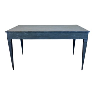 A spacious and comfortable Swedish desk in blue. The top offers ample workspace. Beneath the top are three large drawers, adorned with horizontal millings and a brass handle. The drawers never had locks. Round decorative elements are found in each corner and between the drawers. The sturdy legs, tapering towards the bottom, feature two millings. There's ample (63 cm) legroom under the apron.
